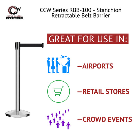 When you need an affordable solution for crowd control, you can join the countless other business owners who trust the CCW Series retractable belt barrier stanchions. The RBB-100 series barriers are designed to provide the best value crowd management solution for your event space. These durable stanchion rope barriers are constructed from rust-resistant polished steel to maximize longevity and minimize your need for replacements. Whether you're looking to manage your customer queues or block off restricted areas, the CCW Series retractable belt barrier will affordably meet your needs. Ideal for use in retail checkout lines, banks and financial institutions, event spaces, airport security checkpoints, and airline check-in lines.
