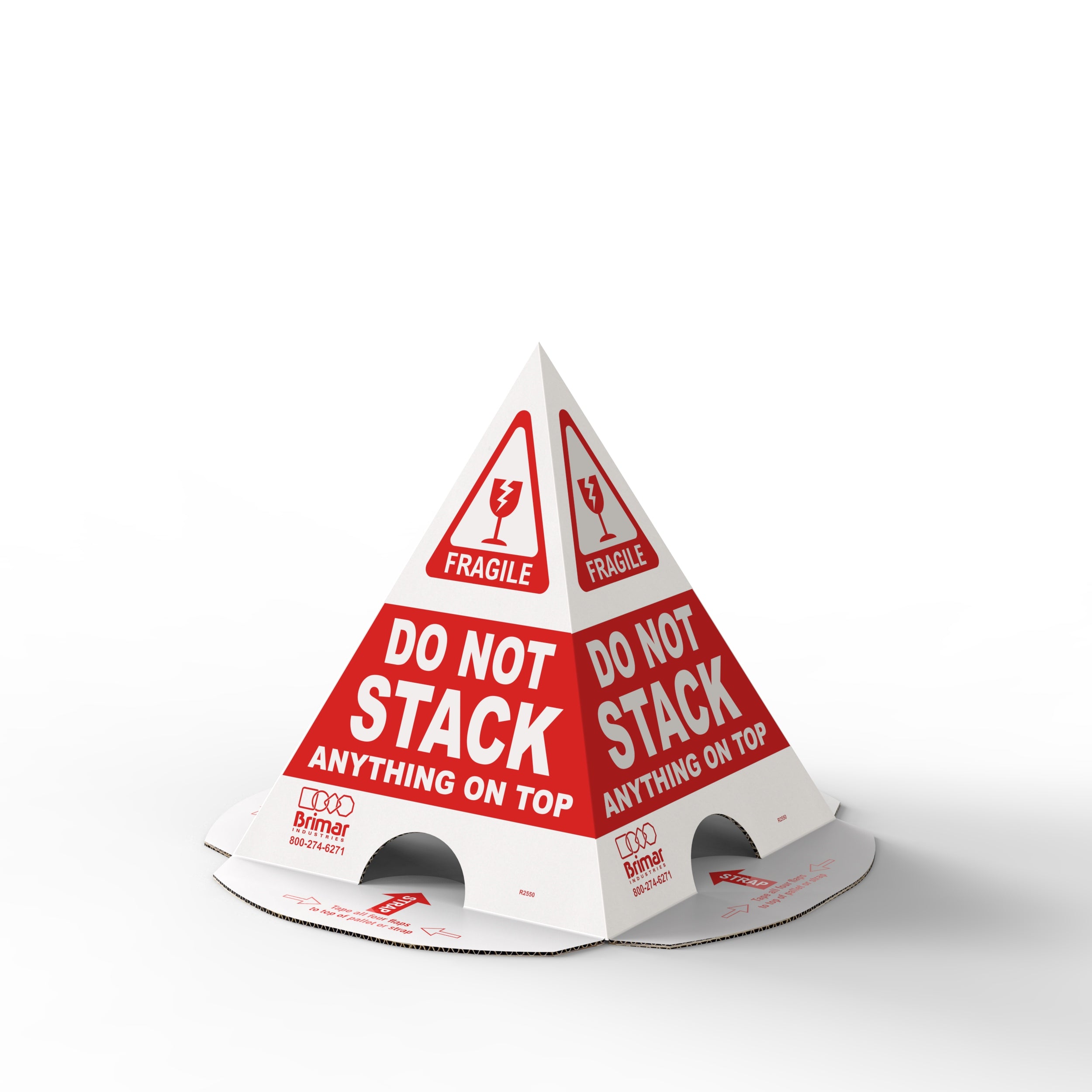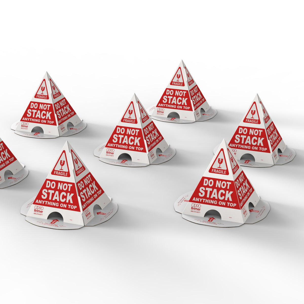 Use these four-sided temporary cones to prevent double-stacking of freight orders or during warehouse storage to reduce damage to palleted items. Attach by strapping, shrink-wrapping, or taping to the top of your pallet. Unlike shipping labels, these three-dimensional cones can be seen from all sides, even when operating a forklift. Made of cardboard, these visual warnings will crush if something is stacked on them, indicating potential damage. A must-have for anyone working in warehouses or storage facilities, these cones ship flat and are easy to compactly store.
