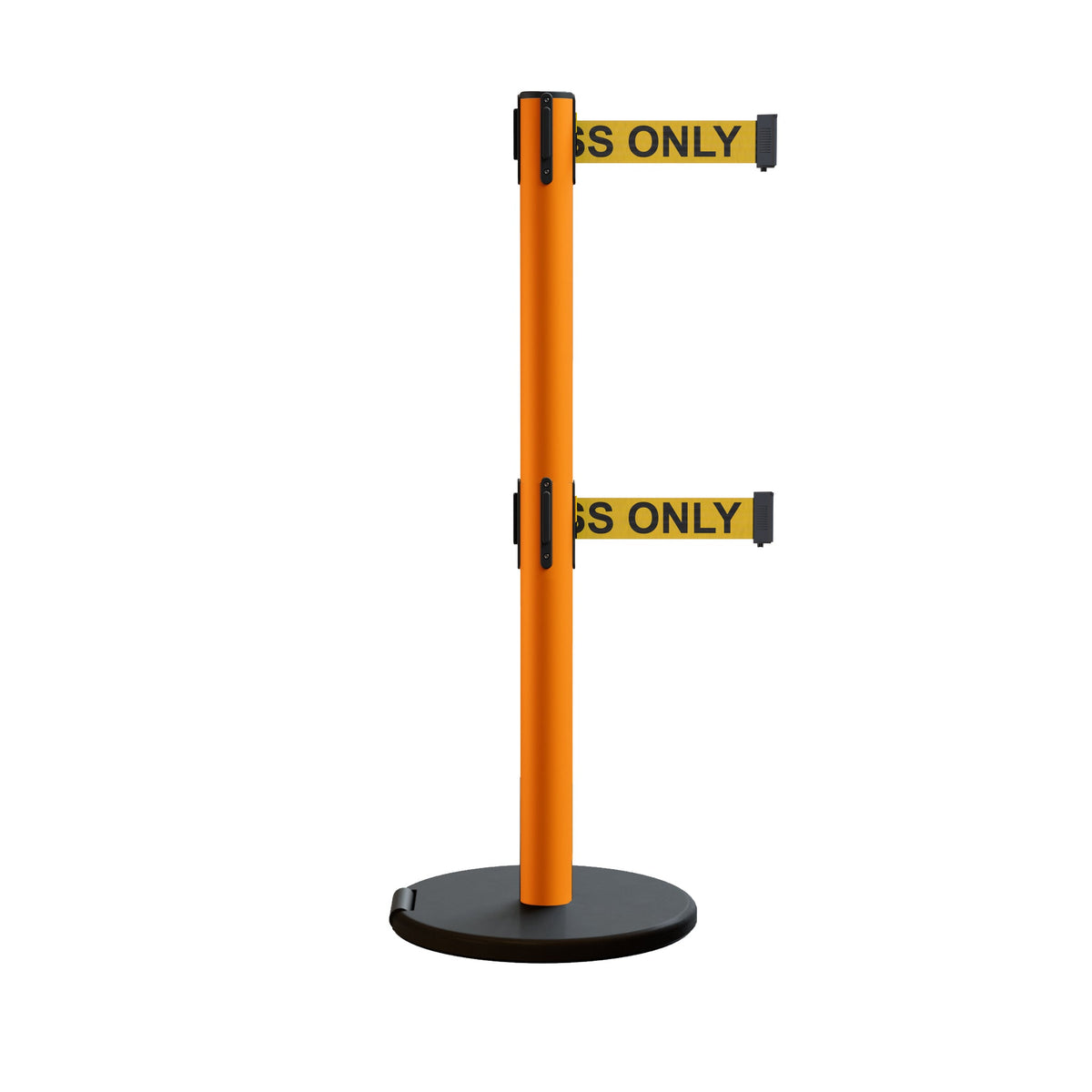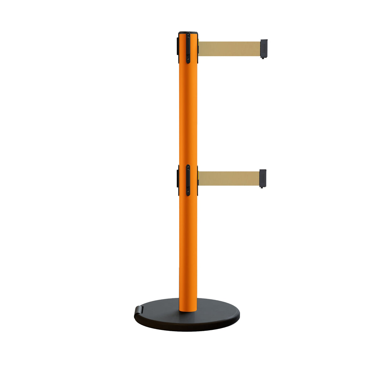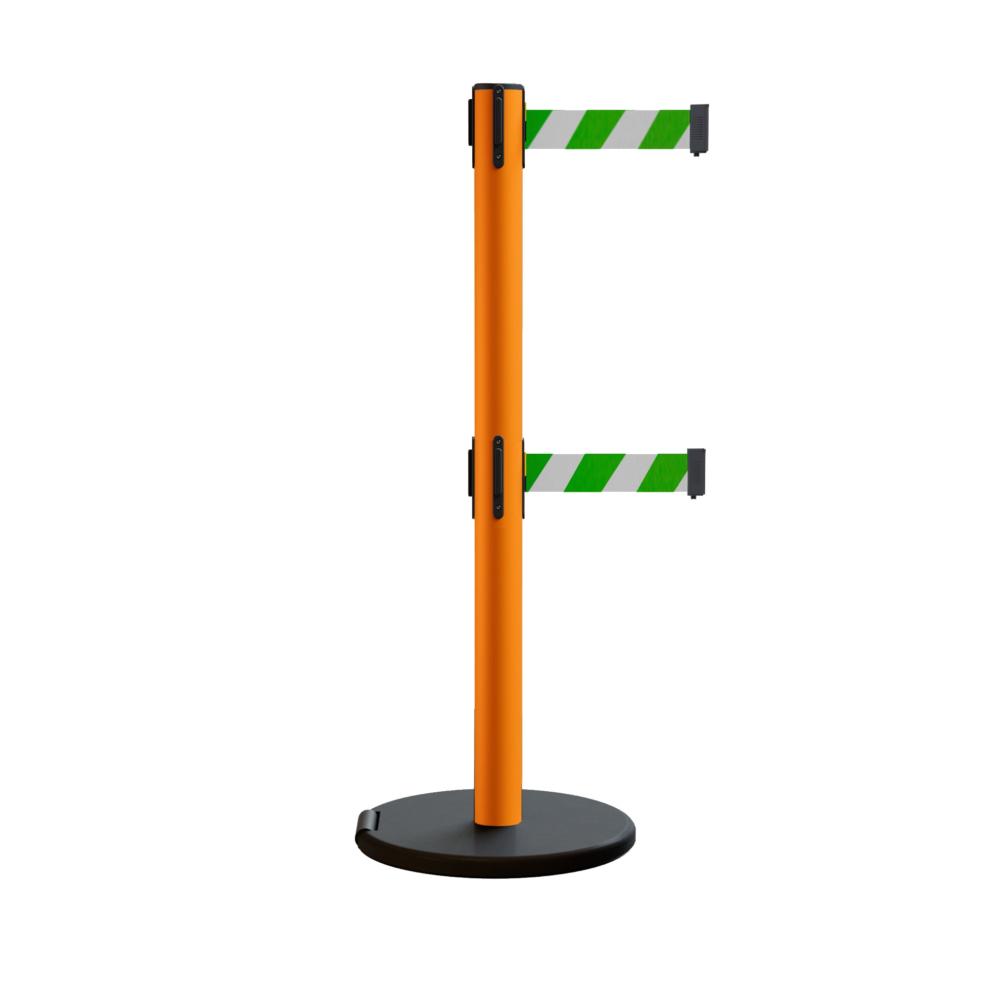 Retractable Belt Barrier Stanchion, Rolling Base, Orange Steel Post, 9 ft Dual Belt - Montour Line MSE630D