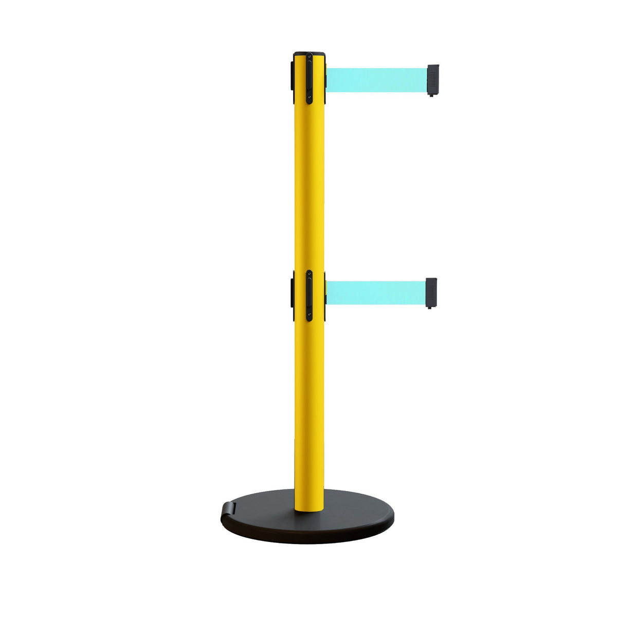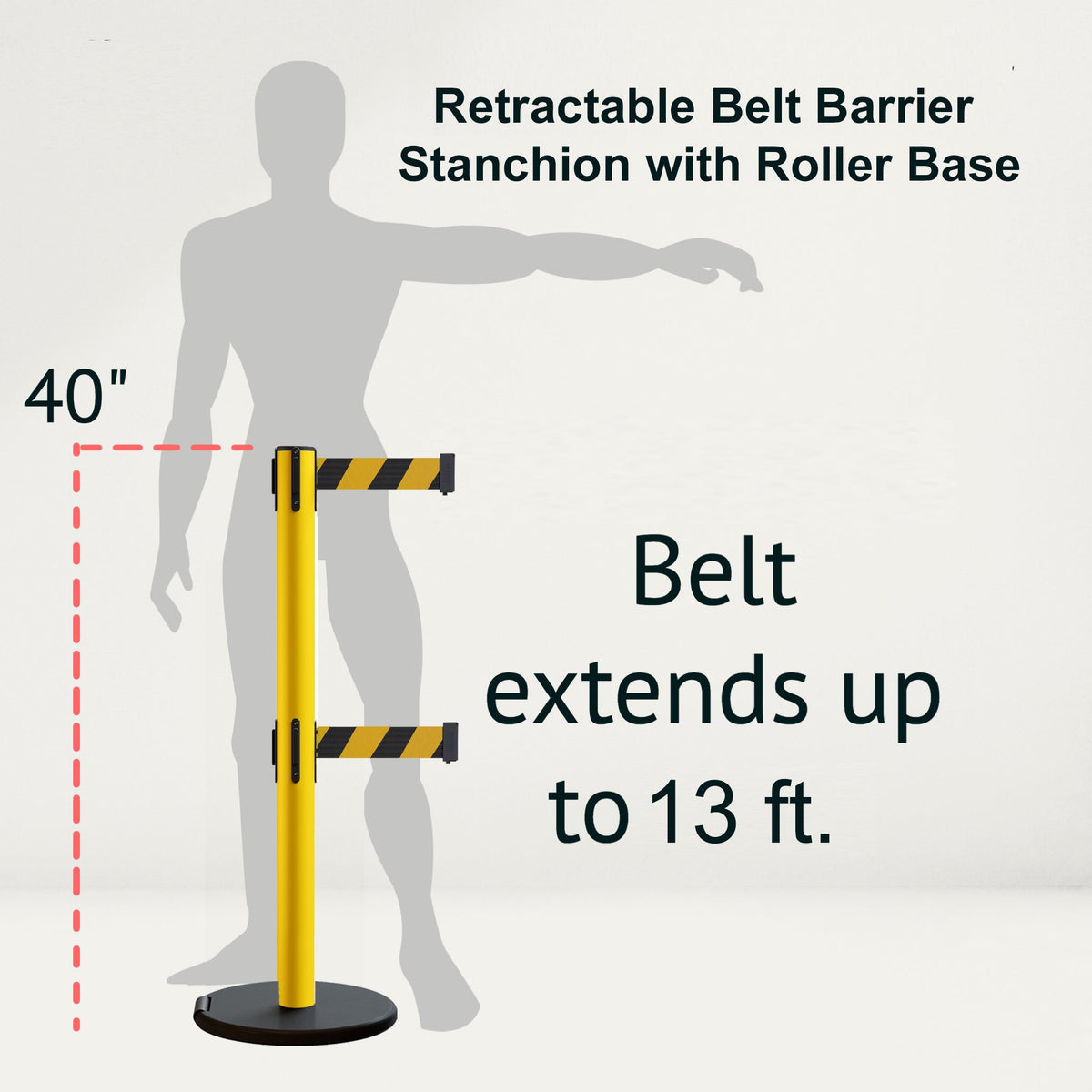 Retractable Belt Barrier Stanchion, Rolling Base, Yellow Steel Post, 13 ft Dual Belt - Montour Line MSE630D