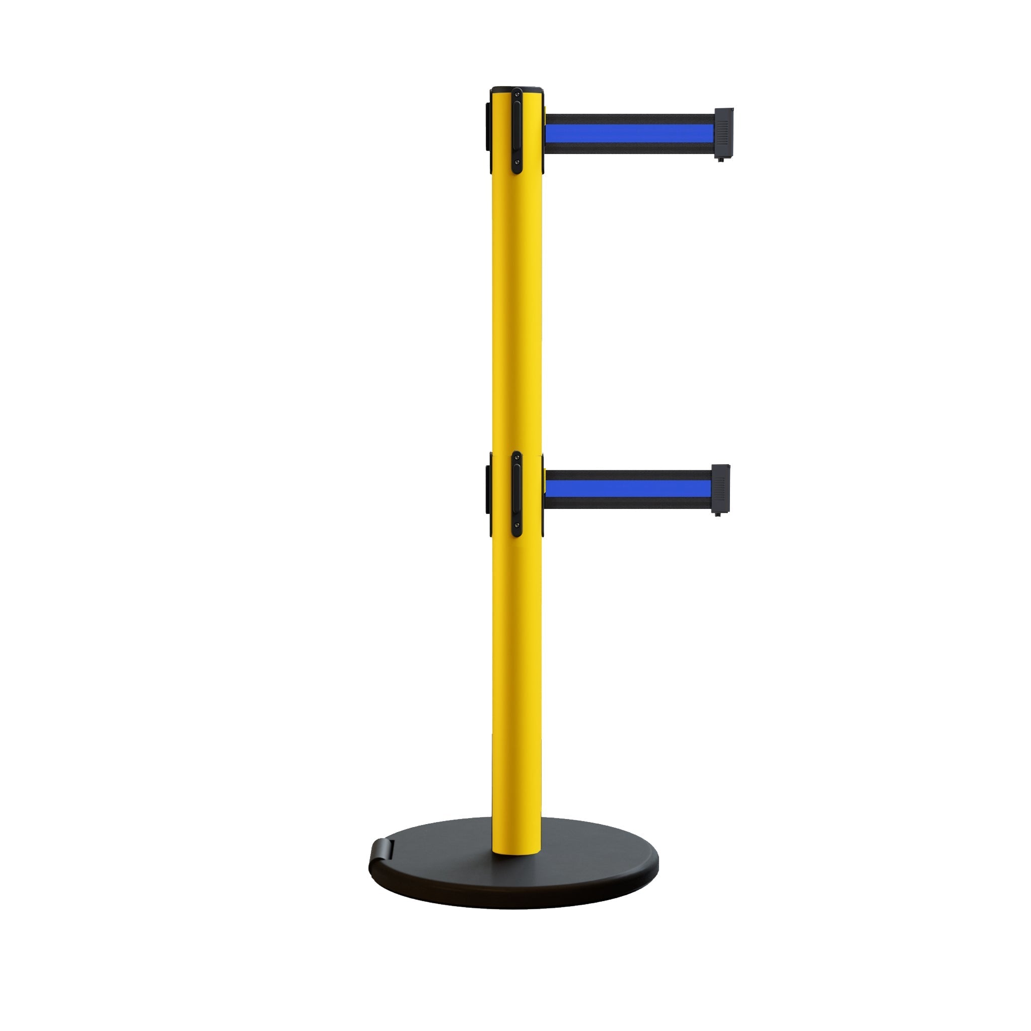Retractable Belt Barrier Stanchion, Rolling Base, Yellow Steel Post, 7.5 ft Dual Belt - Montour Line MSE630D