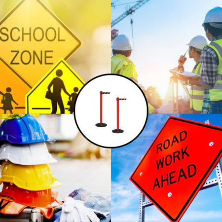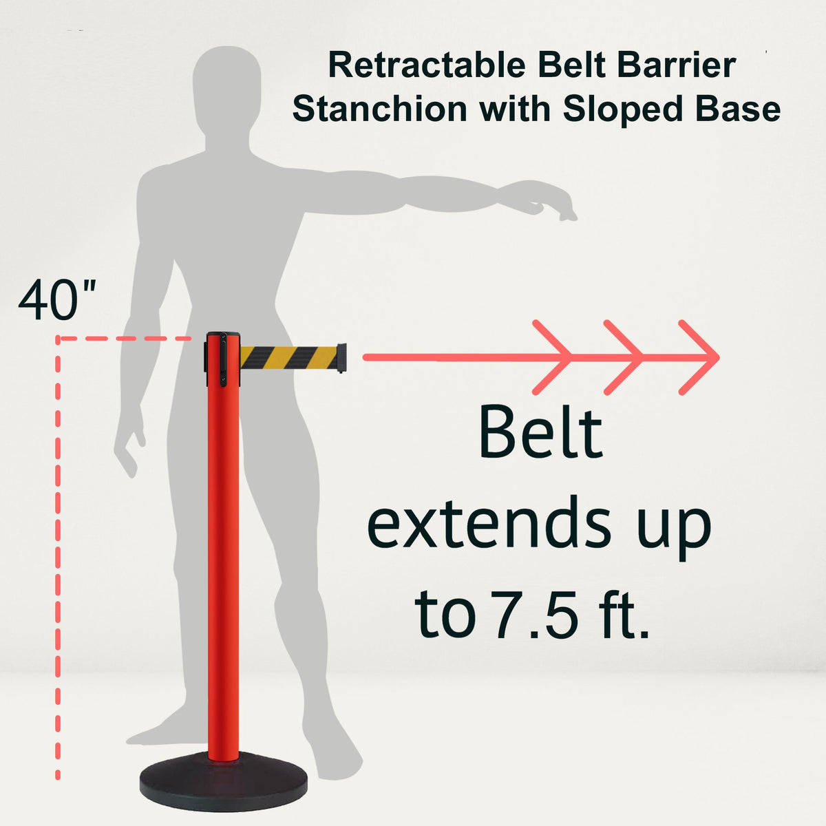 Retractable Belt Barrier Stanchion, Sloped Base, Red Post, 7.5 ft Belt - Montour Line MS630