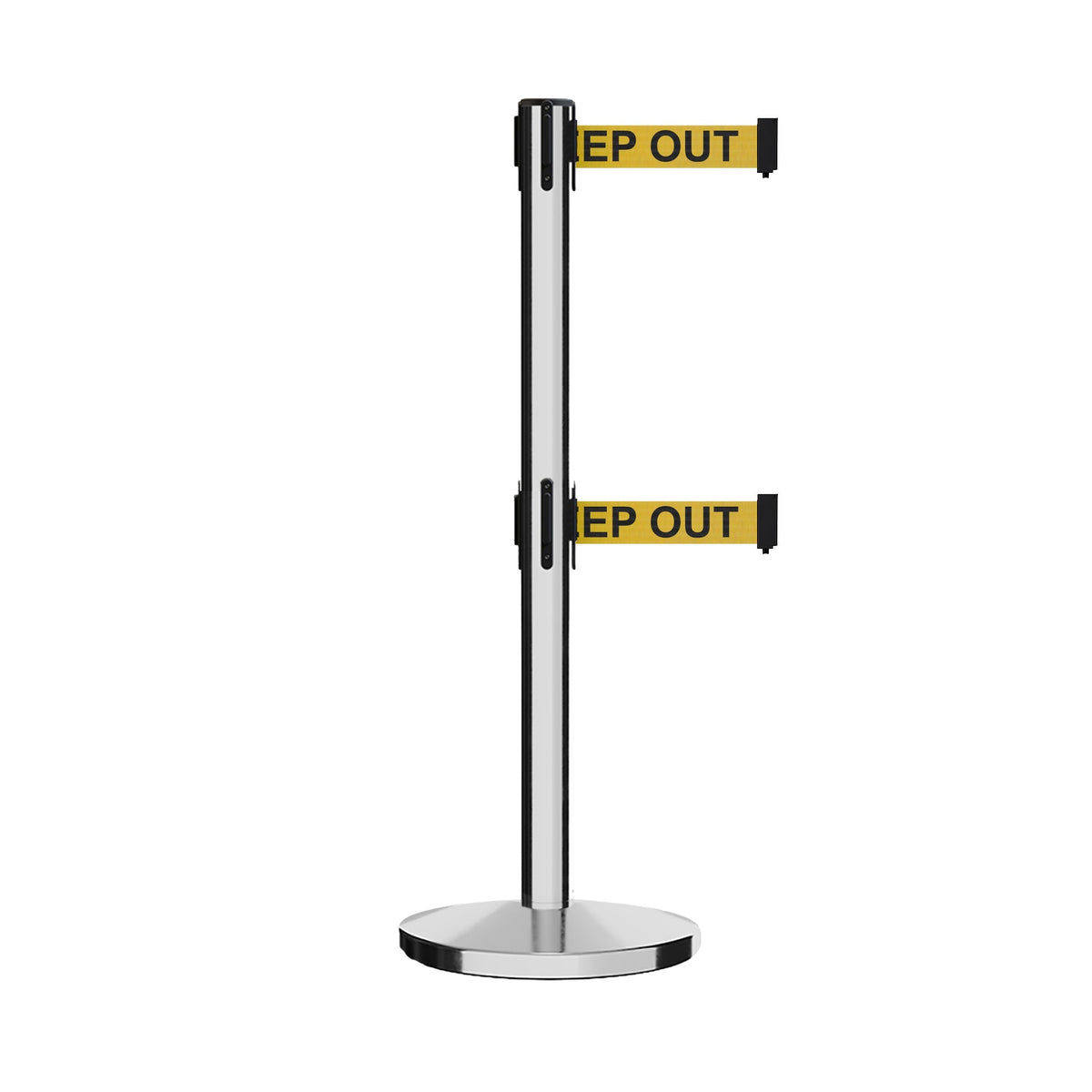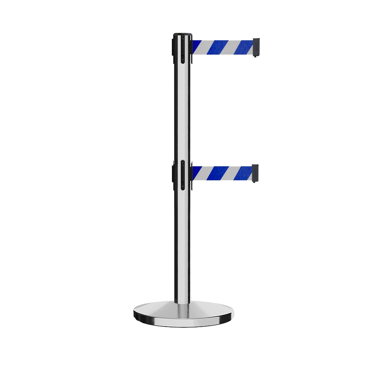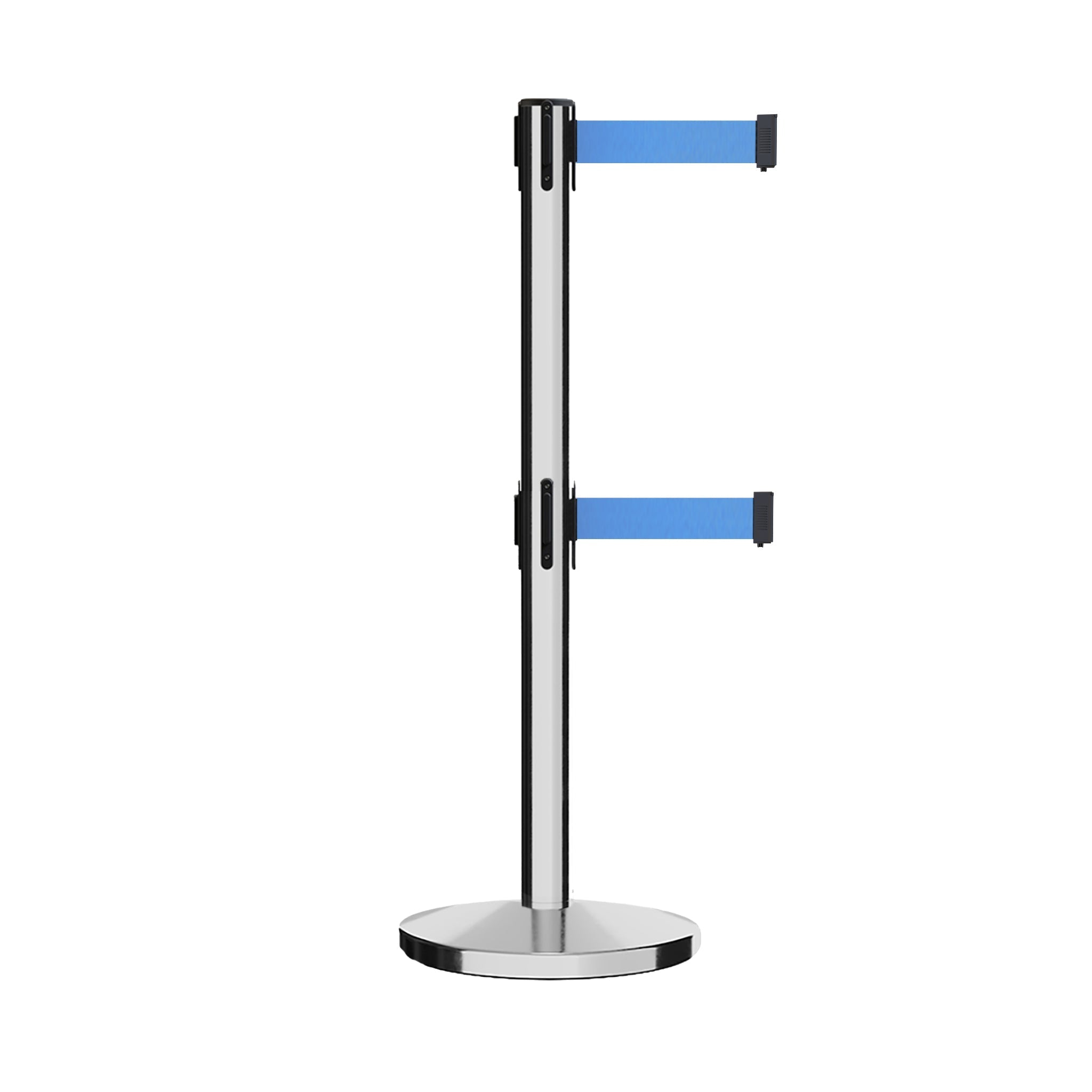 Our economical retractable dual belt stanchion with twin retractable belt barriers is a high value ADA compatible solution for crowd control and queue management. The double belts create a comprehensive barrier of 7.5 feet, 9 feet, or 11 feet and include built in belt braking technology to prevent damage upon retraction. Full-circumference rubber floor protectors keep surfaces safe from damage as well. Belts come in a wide variety of colors and messaging to accommodate any crowd control need.