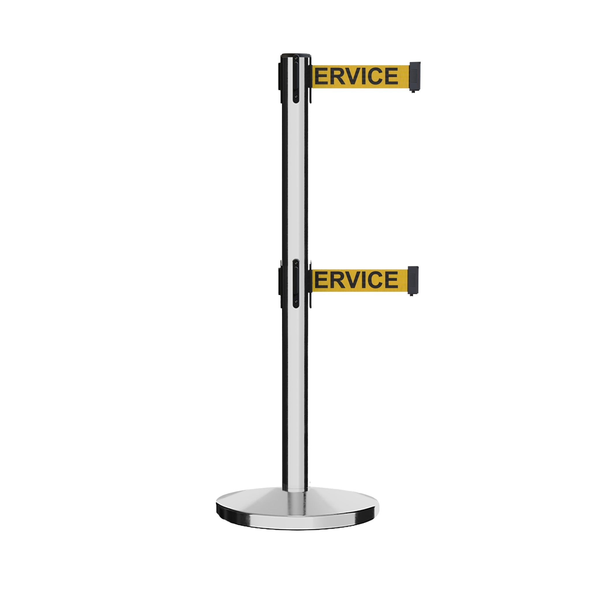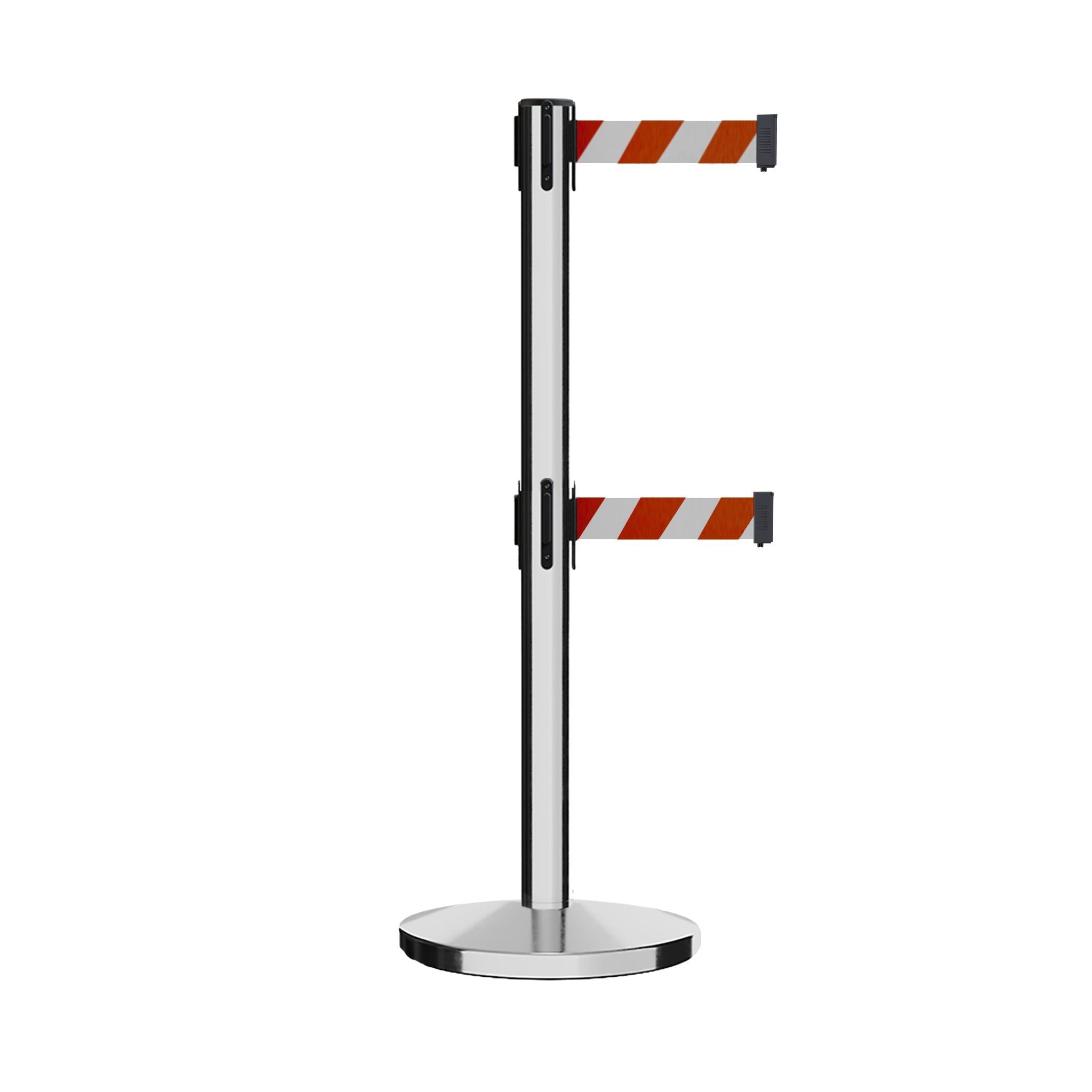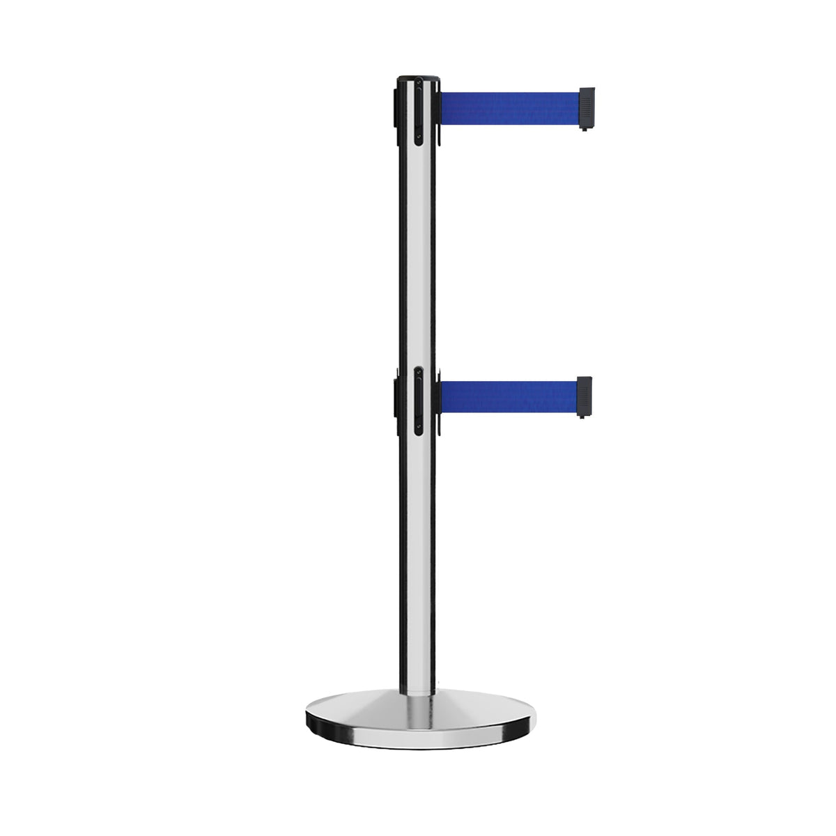 Retractable Dual Belt Barrier Stanchion, Cast Iron Base, Polished Stainless Steel Post, 9 ft Belt - Montour Line MI630D