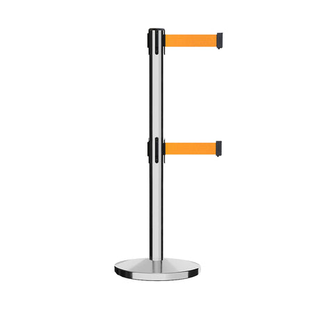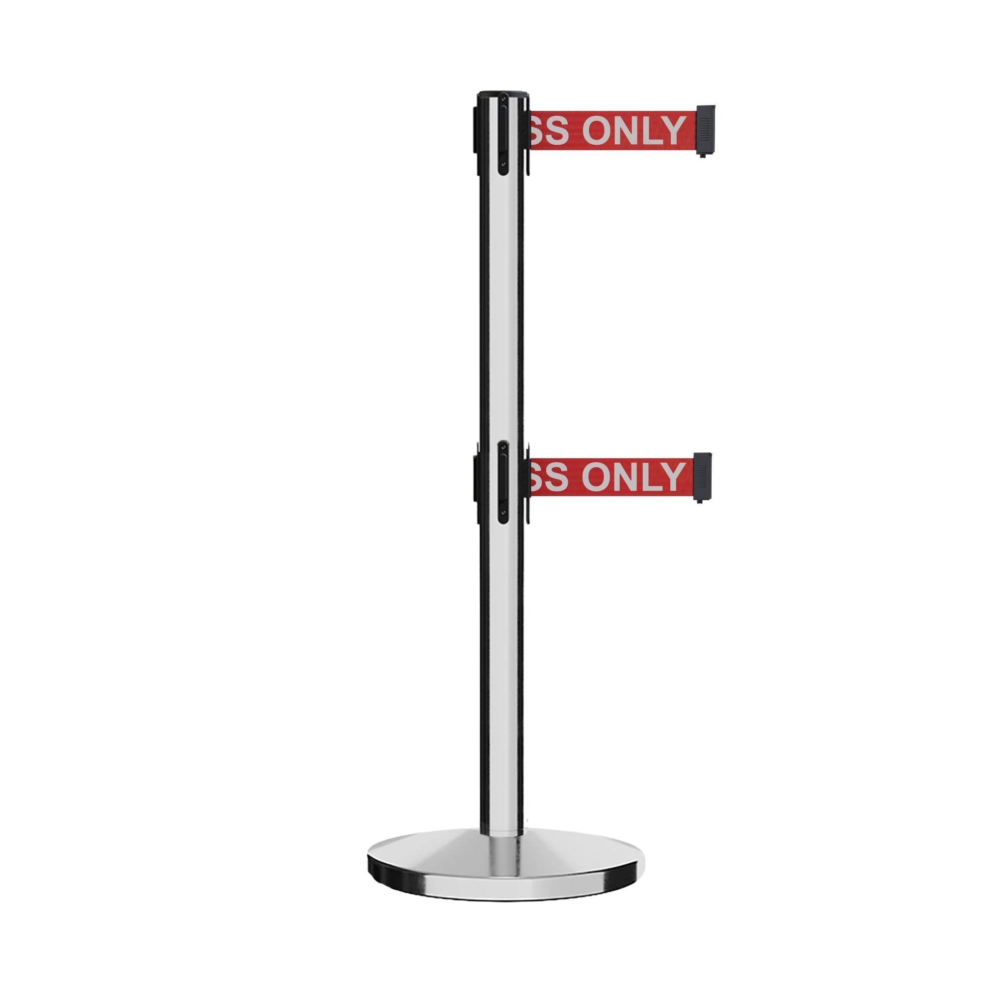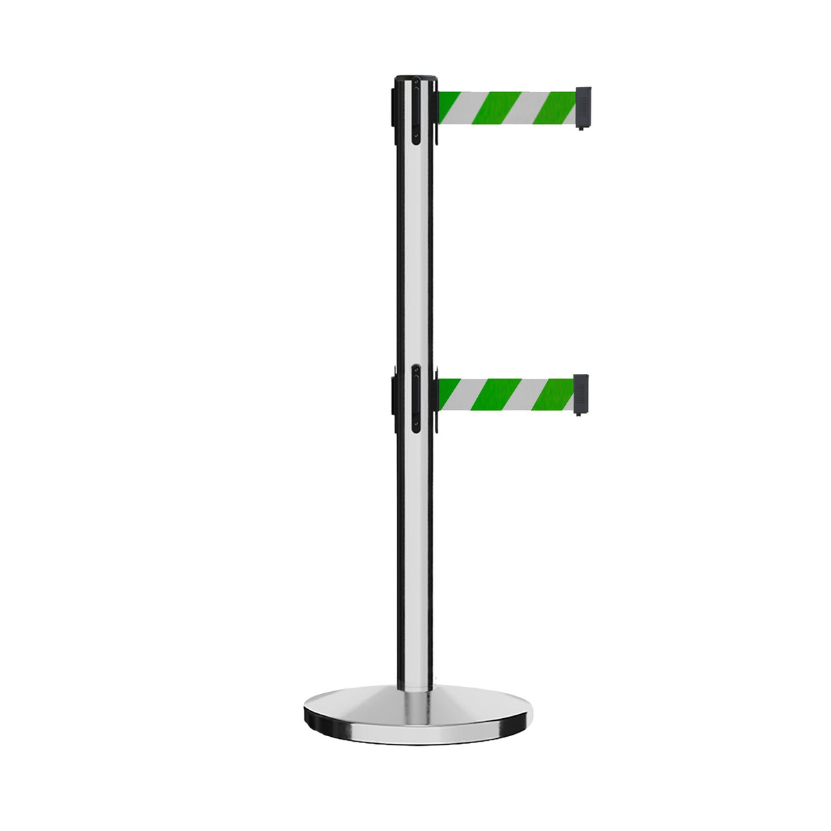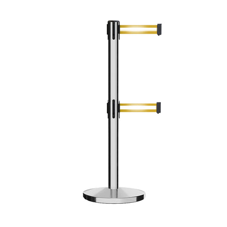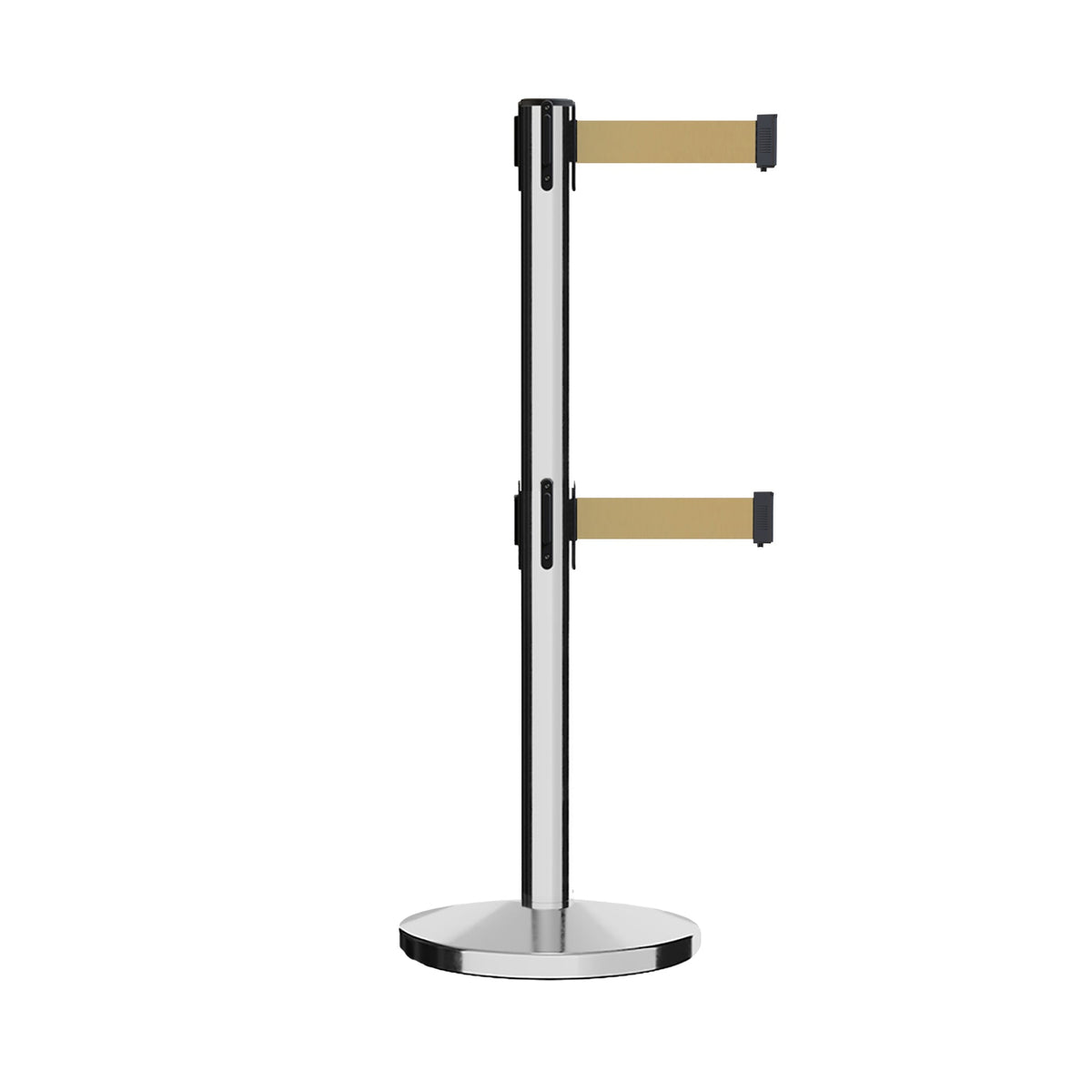 Retractable Dual Belt Barrier Stanchion, Cast Iron Base, Polished Stainless Steel Post, 9 ft Belt - Montour Line MI630D