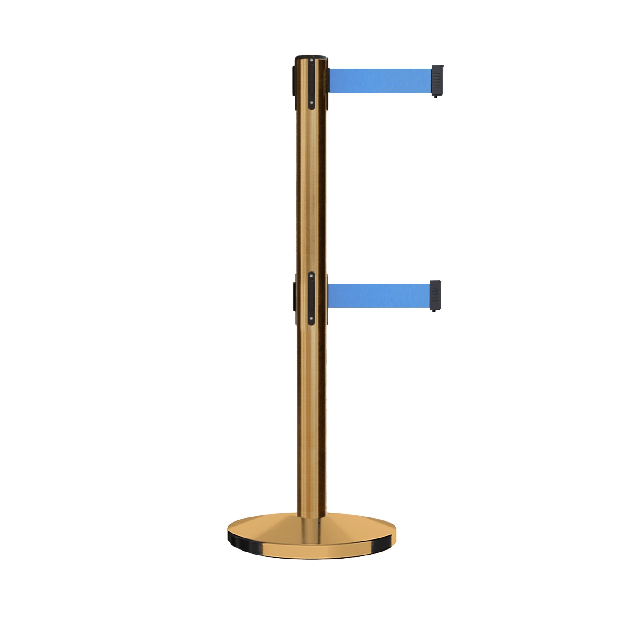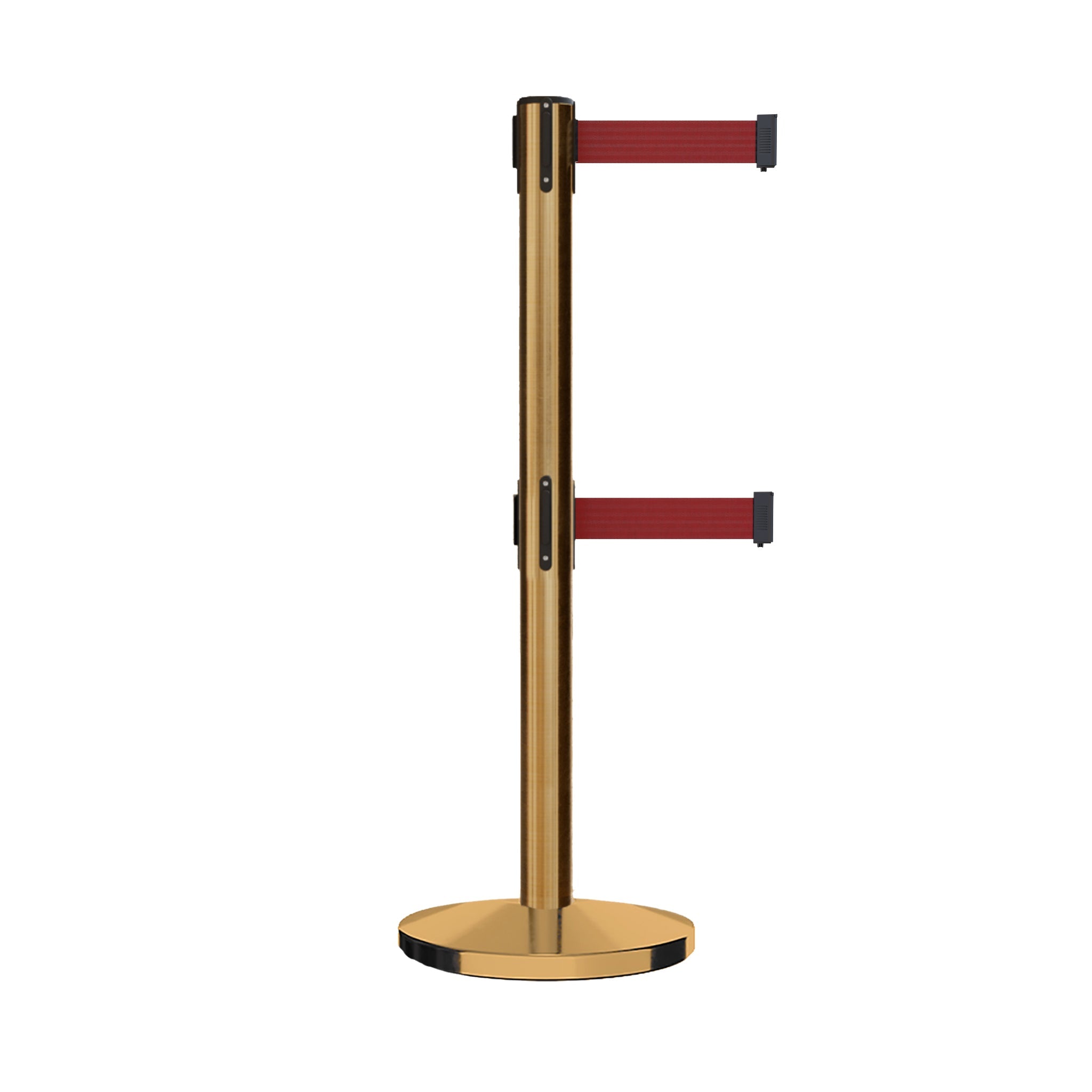 Retractable Dual Belt Barrier Stanchion, Cast Iron Base, Satin Brass Post, 11 ft Belt - Montour Line MI630D - Crowd Control Warehouse