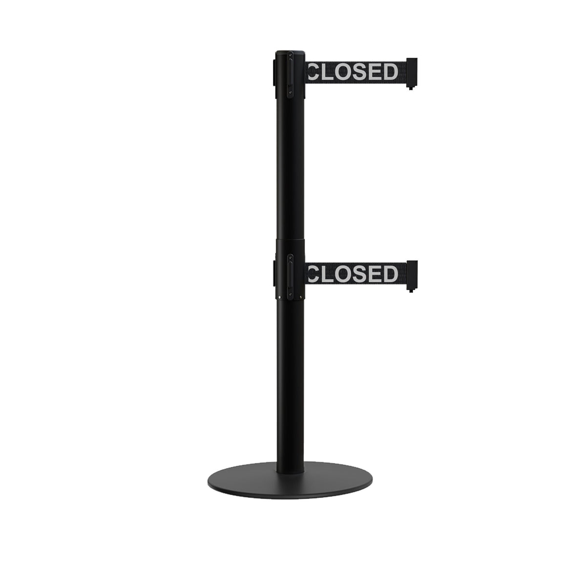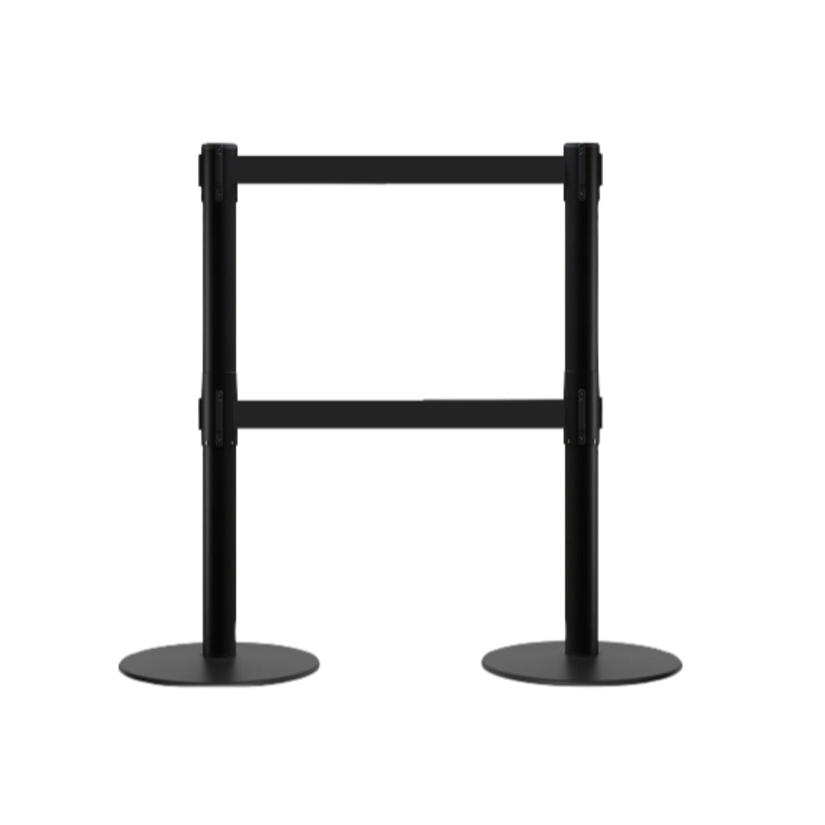 Retractable Dual Belt Barrier Stanchion, Low Profile Steel Base, Black Post, 11ft Belts - Montour Line MX630D